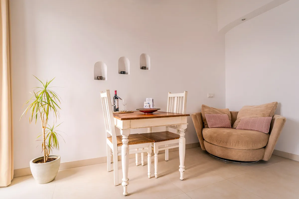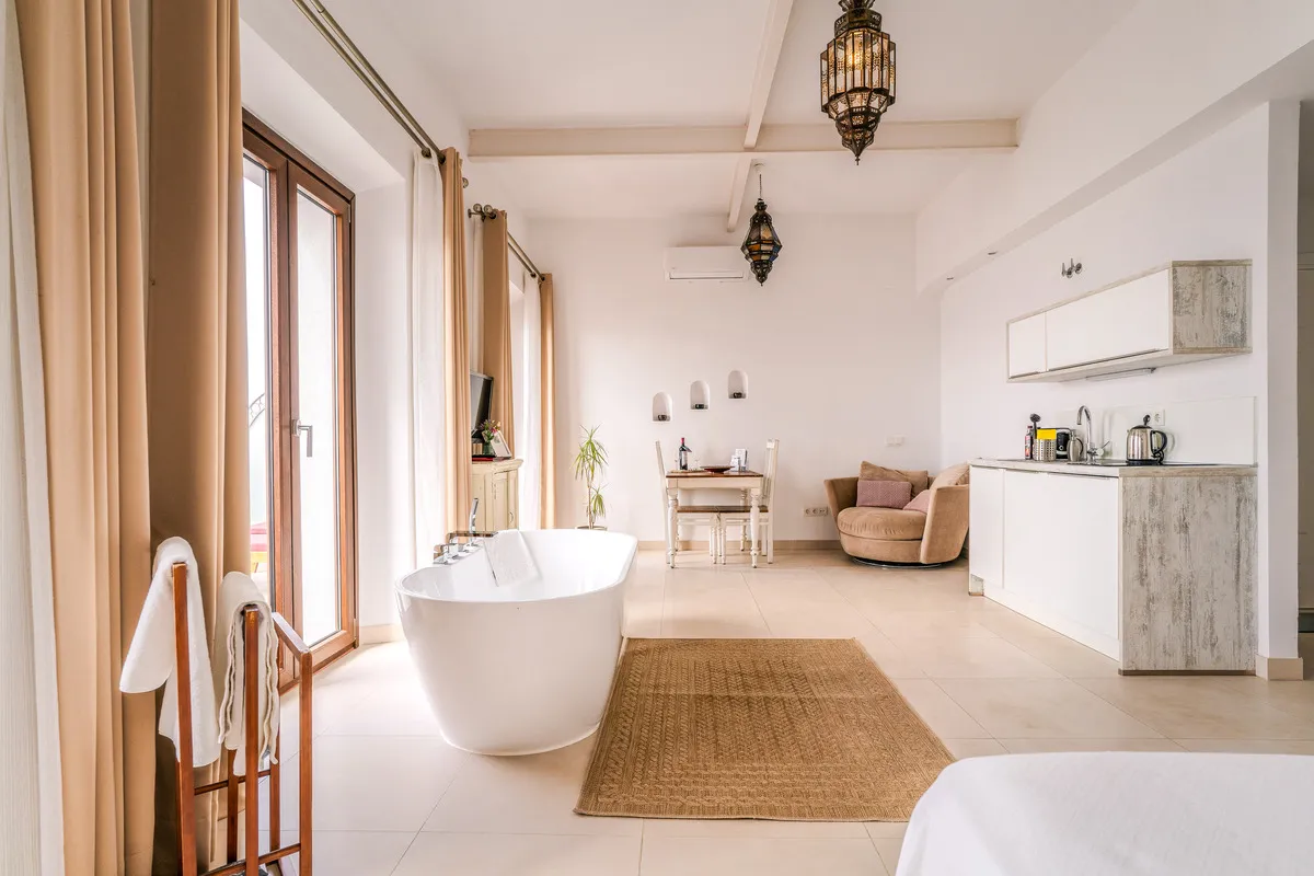Con una maravillosa orientación sur, estos apartamentos incluyen una cama matrimonial de 160 cm y un sofá cama adicional de alta calidad en el salón, que ofrece para tus vacaciones relajantes espacio suficiente para hasta 4 personas (un adulto o dos niños más). Los apartamentos están amueblados en estilo marroquí y tienen una cocina moderna totalmente equipada y un baño con ducha.