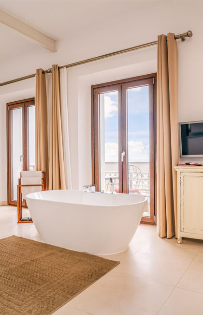 El amplio salón ofrece una vista única de la Plaza «La Mela», el puerto y la costa marroquí. Dando la vuelta al otro lado, disfrutarás de la vista de una iglesia antigua de Tarifa.