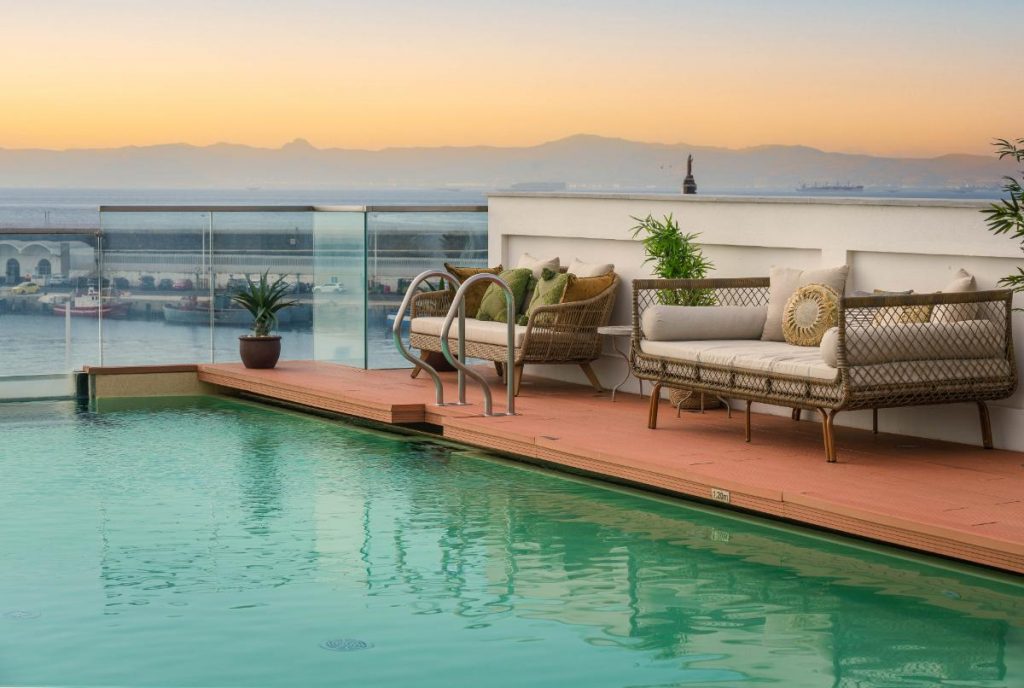 En la azotea del hotel se encuentra una piscina infinita climatizada, con vistas al mar y al Estrecho de Gibraltar.